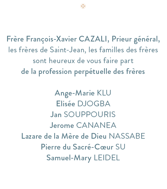 Enfin, frère Pierre du Sacré-Cœur prononcera ses vœux définitifs à une date ultérieure.